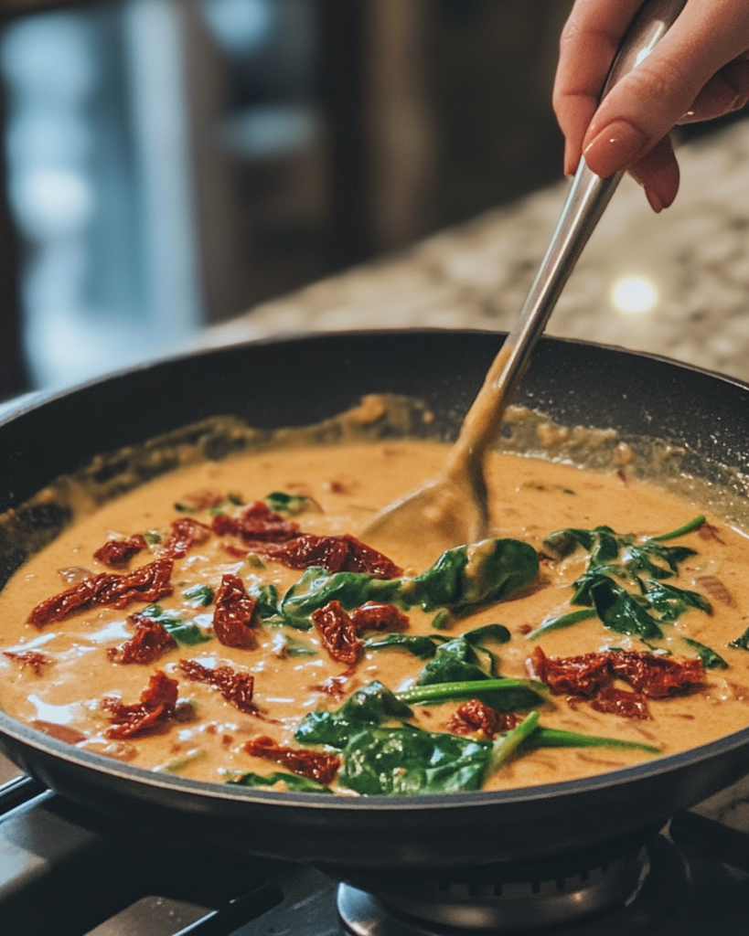 - Add the sun-dried tomatoes and fresh spinach. Stir until the spinach wilts and blends into the sauce.