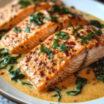 Inspired by the rustic flavors of Tuscany, this dish combines tender salmon fillets with a rich, velvety cream sauce infused with garlic, sun-dried tomatoes, and fresh spinach. It’s the kind of meal that brings people together around the table, encouraging conversation and connection with every bite. Whether you’re celebrating Valentine’s Day with a partner, cooking for someone special, or simply treating yourself to a luxurious homemade dinner, this recipe delivers rich creamy bliss in the most comforting way.