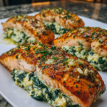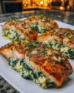 A rich and elegant salmon dish filled with creamy spinach and Parmesan, perfect for romantic dinners or special occasions.