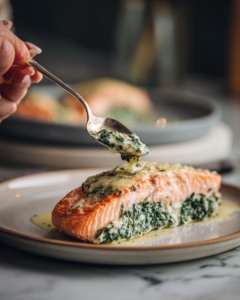 This recipe was born from the idea that elegance does not require complication. Restaurant-quality meals can absolutely be recreated in your own kitchen with fresh ingredients and a bit of intention. Spinach stuffed salmon strikes that rare balance between indulgence and nourishment. It feels luxurious enough for a special occasion, yet wholesome enough to enjoy anytime you want to show care through food. One bite of tender salmon filled with creamy spinach and Parmesan, and you’ll understand why this dish deserves a permanent place in your date night rotation.