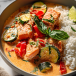 There are certain meals that instantly transport you somewhere warm, vibrant, and comforting, and this Coconut Thai Salmon Curry does exactly that. It is the kind of dish that feels perfect for a quiet evening at home, a busy weeknight when time is limited, or even a casual dinner with friends when you want to impress without stress. The gentle simmer of coconut milk, the aroma of curry paste, and the freshness of herbs create a sense of calm and anticipation as the dish comes together.