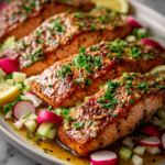 Maple Mustard Salmon with Apple Radish Celery Salad embodies everything a great recipe should be: flavorful, balanced, approachable, and visually stunning. It proves that gourmet cooking does not require elaborate techniques or lengthy preparation. With thoughtful ingredient pairings and attention to detail, simple components can transform into something extraordinary.