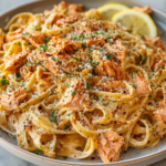 This recipe was inspired by evenings when simplicity met indulgence. It began as a quick solution to use leftover salmon, but over time it transformed into a staple dish—one that feels both luxurious and effortless. With silky pasta, flaky salmon, and a rich garlic cream sauce that clings beautifully to every strand, this recipe proves that you don’t need hours in the kitchen to create something truly special.
