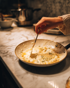 Freshly grated Parmesan melts smoothly into the sauce, adding umami depth and a slight saltiness.