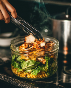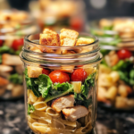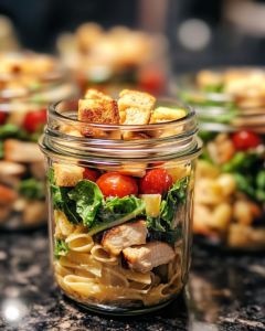Inspired by the bold, savory flavors of classic Caesar salad, this upgraded version combines tender grilled chicken, perfectly cooked pasta, crisp romaine, and a creamy Greek yogurt Caesar dressing. Layered strategically in jars to stay fresh for days, this recipe transforms a beloved favorite into a portable, protein-packed meal. Whether you’re prepping for busy workdays, school lunches, or post-workout recovery, these jars truly change the lunch game.